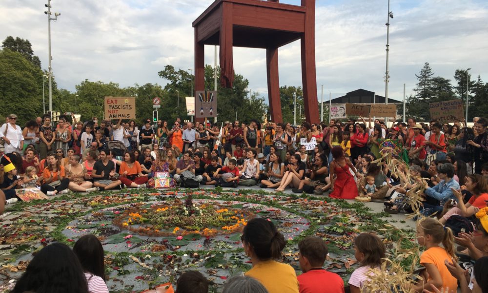 Au sol, à côté de la chaise brisée de la place des Nations, un mandala géant fait de fleurs et de feuilles. L’œuvre de Rita, une des initiatrice du rassemblement. Elle a lancé ce mouvement citoyen sur Facebook la semaine dernière.