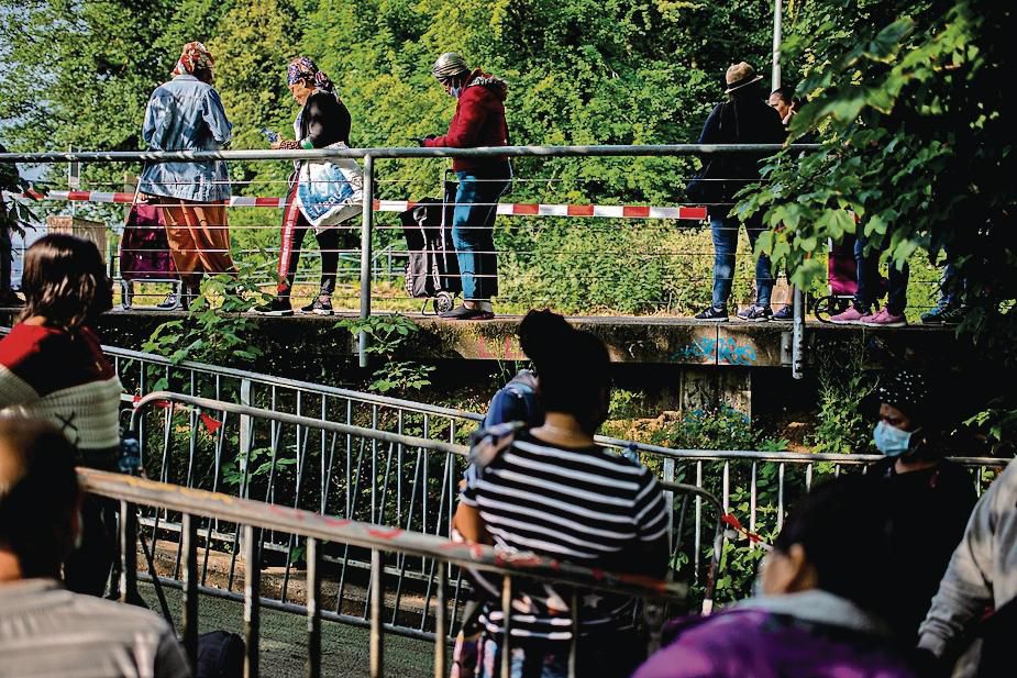Genève, le 23 mai 2020. Nouvelle distribution d’aide alimentaire organisée par les associations et soutenue par la Ville ce samedi aux Vernets. La file d’attente allait jusqu’à la Route de Péniche à la Jonction.