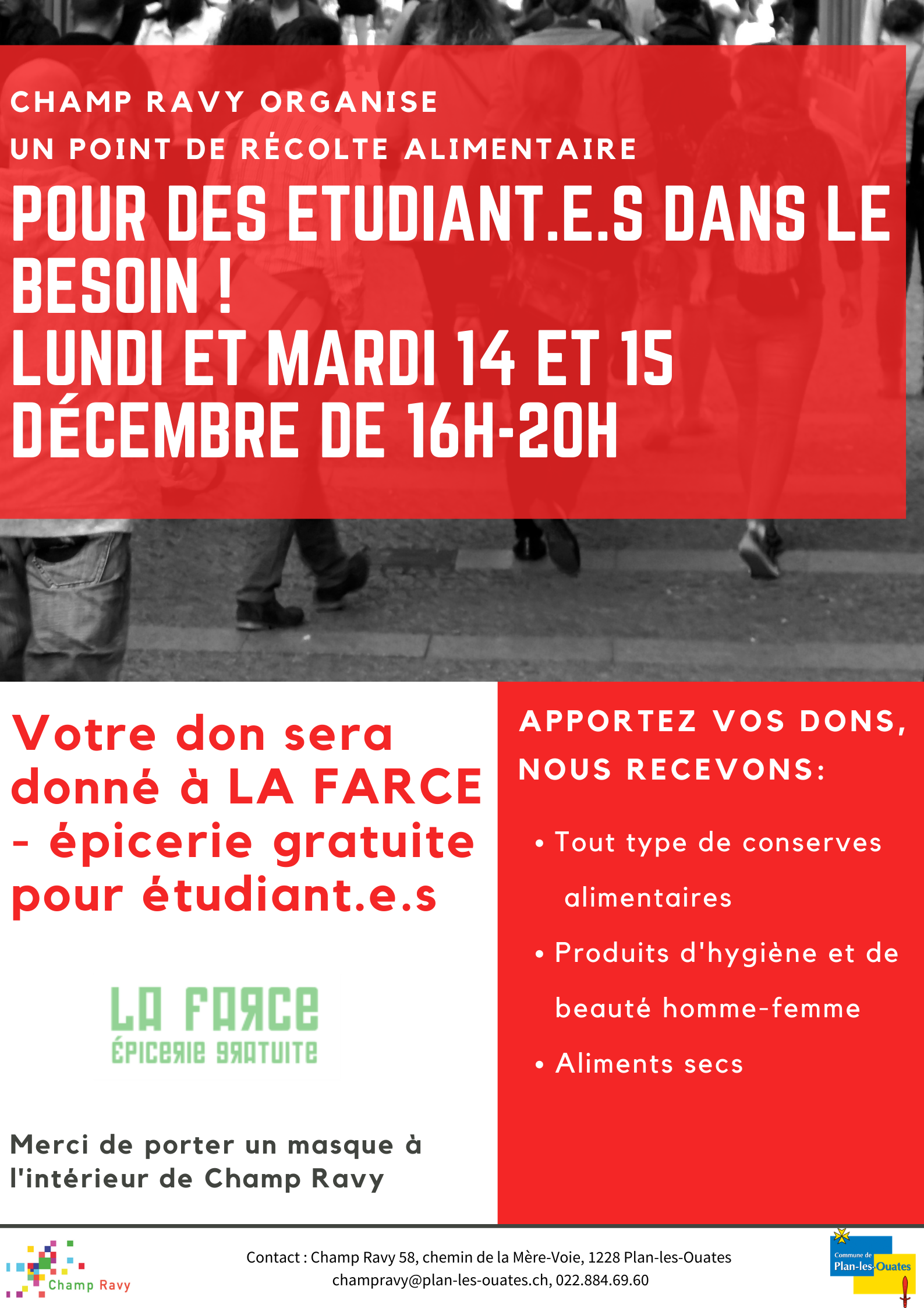 Champ Ravy organise en cette fin d’année deux actions solidaires : une récolte de jouets et de vêtements pour enfants et une récolte alimentaire en faveur d’étudiant-e-s dans le besoin. Vous avez du matériel à donner en cette période de crise généralisée ? Nous vous remercions d’apporter vos dons en bon état, propres et emballés en indiquant si possible le contenu sur les sacs ! Nous vous attendons nombreuses et nombreux le lundi et mardi 14 et 15 décembre 2020 de 16h-20h à Champ Ravy et vous remercions par avance pour votre solidarité.